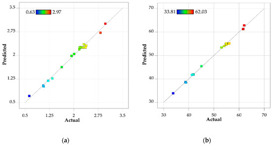 It is depicted from the ANOVA results that the models, which associate with MC and L*, showed 99.1 and 99.7% of the total variations in each system, respectively. Therefore, both the models are appropriate to signify the correlation between the operating parameters and responses. These results were also confirmed from the graphs of the predicted versus observed values as presented in Figure 2.