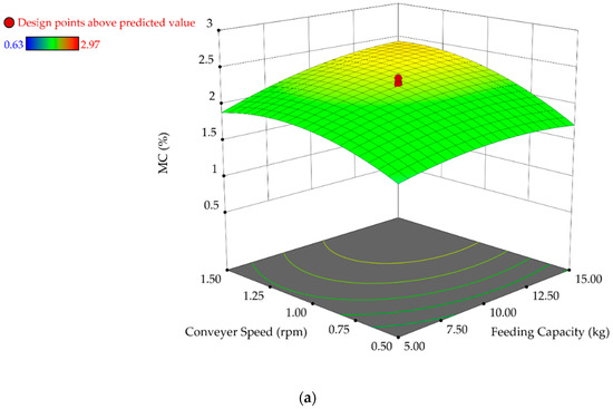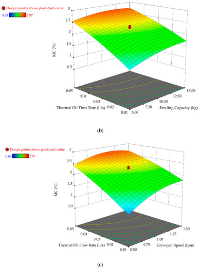 Figure 3a shows the interactive effect of feeding capacity and conveyor speed on MC at the center level of the thermal oil flow rate, 0.03 Ls−1. A positive effect on MC is observed both by the feeding capacity and conveyor speed, in which conveyor speed has a more significant effect than feeding capacity because it regulates the time of roasting. It is clear from the 3D surface plot that increasing the feeding capacity and conveyor speed to maximum levels, resulted in higher percentage of MC (2.41%). On the other hand, MC decreased to 1.59% after decreasing the feeding capacity and conveyor speed to minimum levels. It is because a lower conveyor speed gives longer roasting time, which offers adequate heat transfer to groundnuts even at maximum feeding capacity. This result infers that at prolonged roasting time, more moisture can be removed from groundnut kernels. The experimentation of many authors also revealed that the roasting time is an essential parameter for moisture variations during roasting and MC can be lowered with longer roasting time keeping the temperature constant [32,33].
