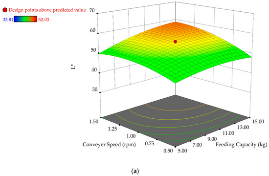 At a constant conveyor speed of 1.0 rpm, the interactive effect of feeding capacity and thermal oil flow rate on the L* is represented in a 3D surface plot (Figure 4b). The L* value of groundnuts was decreased with decreasing the feeding capacity and thermal oil flow rate. The observed value of L* was 39.77 at minimum levels of feeding capacity and thermal oil flow rate and raised up to 59.72 with maximum feeding capacity and thermal oil flow rate. These low (39.77) and high (59.72) values of L* corresponds to dark and light roast conditions respectively, and consistent with the results of other authors [8,19,20,32].