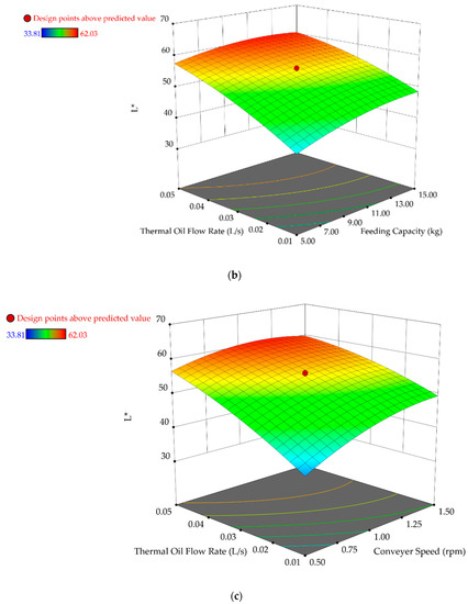 (a) Interactive effect of conveyor speed and feeding capacity on L. (b) Interactive effect of thermal oil flow rate and feeding capacity on L*. (c) Interactive effect of thermal oil flow rate and conveyor speed on L*.