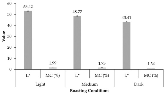The predictability of the models was validated by conducting several roasting experiments at optimum conditions. For each experiment, MC and L* were measured in triplicate and their average values are shown in Figure 5.