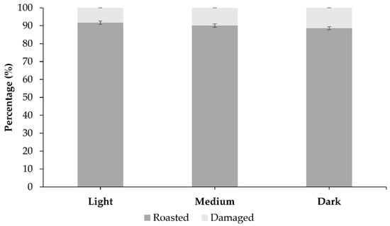 The experimental results for damaged and roasted groundnut kernel at different roasting conditions are shown in Figure 6. It was found that the average roasting performance (Equation (2.7)) of CSR was 91.7 ± 1.0%, 90.1 ± 1.0%, and 88.6 ± 1.0% for light, medium, and dark roasting conditions respectively which implies that the percentage of damaged kernels (by weight) was increased as the roasting time was increased. It might be due to the fact that, as roasting time increases, more moisture was drawn from the kernels and they became more brittle and brittleness makes the kernels more susceptible to breakage during roasting and conveyance [13].