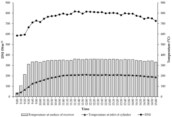 The surface temperature of the heat receiver and inlet temperature variations of the roasting cylinder corresponding to available DNI at each time interval (10 min) were also logged with thermocouples (K-type) and pyranometer, respectively. The recorded results for 24 March 2018 between 09:00 am to 03:00 pm are represented in Figure 8.