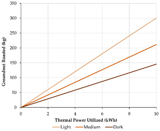 Figure 10 shows the solar thermal energy utilization in kWh during the roasting of groundnuts in kg of light, medium and dark quality attributes. From these curves, one can assess the different weight of the groundnuts of desired qualities at different amounts of available energy and this research can be modeled to design various sizes of solar roasting machines on the basis of thermal energy available for processing/ roasting. It has been observed that 30 ± 1, 21 ± 1, and 15 ± 1 kg of groundnuts can be roasted in CSR by utilizing 1 kWh of solar thermal power subjected to light, medium and dark roasting quality respectively. Also considering the results under Section 3.4, CSR has the capacity to produce about 10 kW/day useful thermal energy for the roasting of groundnuts on a sunny day.