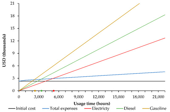 Figure 11 shows the graphical representation of the break-even point analysis of CSR. The golden, green and red line cuts the blue line at 2450, 3450, and 5200 useful working hours respectively which are the payback periods when gasoline, diesel, and electricity were used for energy generation respectively.