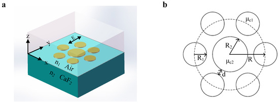 As shown in Figure 1a, the oligomer consisting of seven graphene nanodisks is placed on a calcium fluoride () substrate with a refractive index of 1.4 and surrounded by air with a refractive index of 1. In the infrared spectral region, is transparent and this structure has no effects of substrate phonon [29]. Therefore, using as substrate can eliminate the coupling problem between the plasmon and phonon in the graphene plasmonic structure [30]. According to the requirements of the substrate, calcium fluoride also can be replaced by potassium bromide or other infrared transparent materials. In order to further understand the structural parameters, the projection of the oligomer on the XOY plane is given in Figure 1b. Six graphene nanodisks of the same size are evenly placed on a circle with a radius R = 160 nm and a nanodisk with a radius = 90 nm is in the center of this structure. The radius and chemical potential of the satellite nanodisks are 50 nm and 0.5 eV, respectively. The distance between center nanodisk and ring nanodisks d is kept at 10 nm. In this system, the power of incident light is set as W. In order to avoid the reflected light fields, the perfectly matched layer (PML) is set around the nanostructure. In addition, the thicknesses of seven graphene nanodisks are meshed by at least five layers and the maximum element size in the graphene layer is set as 2 nm to ensure the accuracy of simulation. Simultaneously, the mesh size increases gradually from graphene nanodisks to the PML.