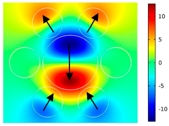 In order to analyze the electromagnetic behavior at Fano resonance, the near-field electric field distribution of the Fano resonance is calculated. The radius of the central nanodisk and the satellite nanodisks are 90 nm and 50 nm, respectively. The chemical potential of the central nanodisk is set as 0.6 eV, and that of the six satellite nanodisks are 0.5 eV. The extinction spectrum of this structure is depicted in the bottom of Figure 3b, whereas the near-field distribution at the Fano resonance frequency is presented in Figure 4. It is clear that the dipole resonances of the top two nanodisks and the bottom two nanodisks in this structure are in phase. However, compared with these four nanodisks, the dipole resonance of the central nanodisk is an out-of-phase oscillation. The Fano resonance of this heptamer becomes possible due to the opposite dipole resonances. Furthermore, not all nanodisks have an effect on this collective behavior. The dipole resonances produced by the leftmost and rightmost nanodisks are weaker than those of the other nanodisks. Therefore, when the structure of the leftmost and the rightmost nanodisks changes, the impacts on the collective behavior are negligible. Therefore, to dwell on the influence of ring nanodisks on this collective behavior, we modify the chemical potential and radius of the target nanodisk and calculate the extinction spectra.
