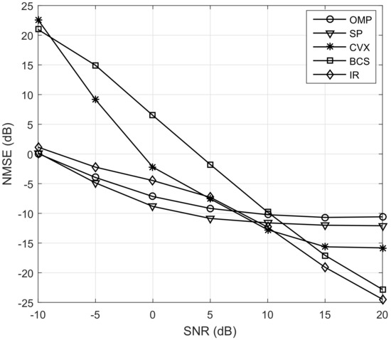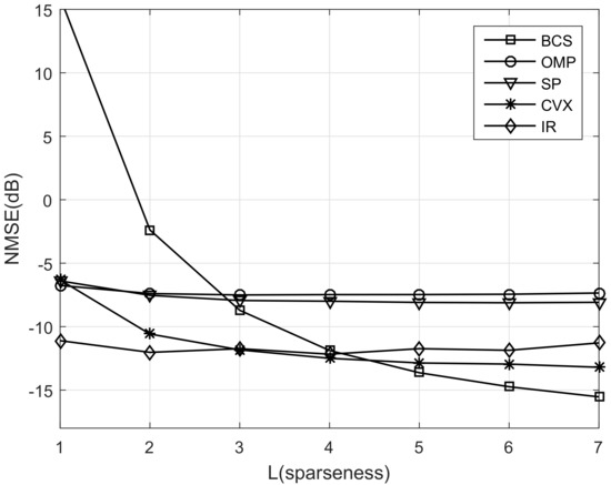 In Figure 3, we illustrate the NMSE performance versus the sparseness L. We can see that the NMSE of greedy iteration algorithms remains unchanged with the sparseness increasing, approximately, since the most relevant columns are selected in each iteration. The performance of IR algorithm also remains unchanged. Moreover, it is better than others at the low sparseness range. In addition, the performance of BCS and CVX algorithms improve as the sparseness increases. This is because the assumptions of prior distribution and the condition that let norm replace norm are fitted better when the sparseness increases. Furthermore, we can observe that the performance of BCS algorithm is better than greedy iterative algorithms when the sparseness is larger than 3 and the gap even reaches 8 dB when the sparseness is 7.