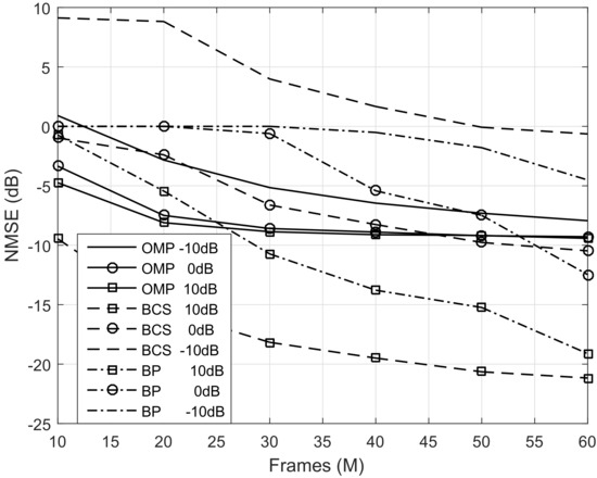 To efficiently acquire the CSI, pilot-aided channel estimation algorithms are widely studied [9,10,11,12,13,14], which can be divided into three categories, i.e., convex relaxation algorithms, greedy iterative algorithms and Bayesian inference algorithms. Specifically, based on the frequency-flat geometric channel model, the CSI of complex gains, angles of arrival (AoAs) and angles of departure (AoDs) were estimated through gradient descent algorithm in [9]. In [10], by exploiting sparse and low-rank structures of the mmWave massive MIMO channel with angle spread, the two-stage compressed sensing algorithm was proposed to reduce the sample complexity. In [11], the angle spread at receiver was estimated by greedy iterative algorithms and the normalized mean squared error (NMSE) was compared among different greedy iterative algorithms. In [12], the frequency selective channel was recovered with orthogonal matching pursuit (OMP) algorithm in the single carrier (SC) system and orthogonal frequency division multiplexing (OFDM) system, respectively. In [13], the off-grid sparse Bayesian learning algorithm was proposed to estimate CSI in an uplink multiuser mmWave massive MIMO system. In [14], the Bayesian compressed sensing (BCS) algorithm was adopted to recover the channel matrix based on a geometric channel model, where the transmitter’s hardware impairments were taken into consideration. Note that the prior works have investigated these channel estimation algorithms based on different assumptions and drawn some conclusions. However, these conclusions are only for specific parameter ranges under different scenarios. To the best of our knowledge, there is no comprehensive comparison among CS-based channel estimation algorithms with a unified framework for mmWave massive MIMO systems.
