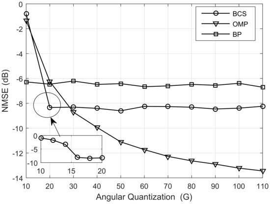 In Figure 5, we illustrate the NMSE performance versus the angle quantization G. We can see that the performance of BP algorithm is hardly affected by angle quantization, which means it can avoid the quantization error as the AoAs and AoDs are accurately estimated by gradient descent method in each iteration. However, the estimation quality of BP algorithm is worse than OMP and BCS algorithms when the angle quantization is larger than 20. For the OMP algorithm, the MNSE decreases as angle quantization increases, which means the angle quantization is a key factor that affects the estimation performance of OMP algorithm. As to the BCS algorithm, the NMSE curve goes down rapidly and then stays flat, which indicates there is an optimal angle quantization G for it.