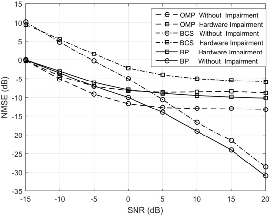 In Figure 6, we show the effect of transmitter’s hardware impairments on channel estimation quality, where the noise contained in the SNR is the AWGN without considering the angle quantization error and the hardware impairments. We can see that the estimation quality of all algorithms is affected by the transmitter’s hardware impairments, especially at the high SNR range. This is because the transmitter’s hardware impairment can be regarded as the extra noise and it is the main component of noise at the high SNR range. It is worth mentioning that the hardware impairments will increase with the increase of transmission power, which means simply increasing the transmission power cannot avoid the hardware impairments. Therefore, estimation and compensation are necessary for a practical mmWave massive MIMO system to combat them.