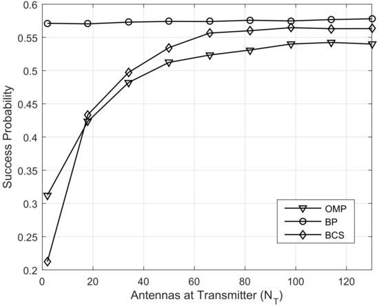 In Figure 7, we illustrate the success probability of channel estimation versus the number of antennas at the transmitter. Without loss of generality, we set , and dB, which indicates the number of RF chains and the uniform grid of angle quantization G linearly increase when the antennas as transmitter sincrease, and the channel estimation is successful when the estimated error is less than −10 dB. We can observe that the success probability increases and then remains unchanged as the number of antennas increases for OMP algorithm because the angle quantization error at transmitter limits the success probability when the number of antennas is small, but the angle quantization error at receiver is the decisive factor when the antennas of transmitter is large enough. The same phenomenon can be observed in the BCS algorithm. However, different from the OMP algorithm, the number of available pilot symbols is the main factor that limits the success probability of BCS algorithm. As for BP algorithm, the number of antennas has little effect on the success probability, since the NMSE of BP algorithm is mainly affected by SNR at the receiver.