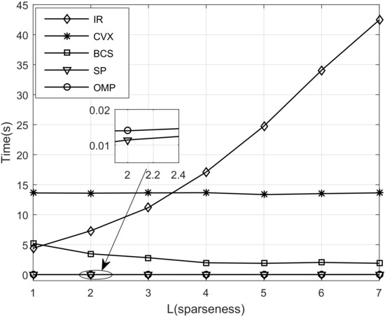 In Figure 8, we can observe that the runtime of IR algorithm increases squarely with the sparseness, approximately. At the low sparseness range, calculating the gradient has no significant contribution to runtime but it is the main source when the sparseness increases. The runtime of CVX algorithm remains unchanged but much longer than others as the CVX is a common toolbox and its runtime is not affected by the sparseness. It is worth mentioning that the runtime of BCS algorithm decreases with the sparseness increasing because the algorithm will break out ahead when the accuracy is satisfied. On the other hand, it can been observed that the runtime of greedy iterative algorithms is shortest and grows linearly with the sparseness increasing, since there are no complicated operations of the matrix. Among the greedy iterative algorithms, the runtime of OMP algorithm is longest as only one column is selected in each iteration.