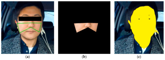 Region-of-interest (RoI) selection procedure: (a) face detection and cheek region cropping. (b) Selected skin region and (c) background region except for any skin region where the photoplethysmography (PPG) signal can be detected (the skin region is indicated in yellow).