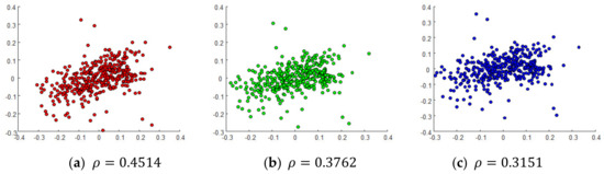 Plots of the correlation and correlation coefficients () between the face (horizontal axis) and background (vertical axis) signals in each channel. Each dot denotes samples of the joint blind source separation (JBSS) results at every frame: (a) red channel; (b) green channel; (c) blue channel.