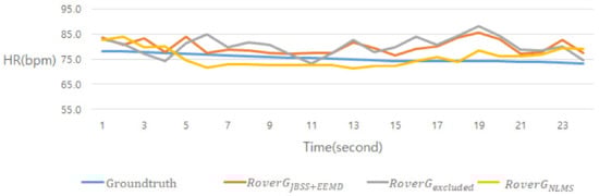 It may not be as apparent that the experimental results in Figure 6 followed the tendency of the HR, because the subjects included in Figure 6 ranged from the relatively short interval of a fast HR to the long interval of the normal state. However, even though it was not sharply revealed by the Bland–Altman plot, not only were the differences between the estimated values and the ground-truth less than 5 bpm, but the highest performance was also obtained based on the quantitative numerical values shown in Table 3. Moreover, as shown in Table 3, the Pearson correlation (), which is related to tendency, yielded the highest performance using the proposed algorithm compared to other algorithms.
