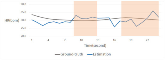 Figure 5 displays the relationship between the ground-truth and the estimated HR results. The estimated HR followed the ground-truth closely and did not fluctuate dramatically due to external factors.