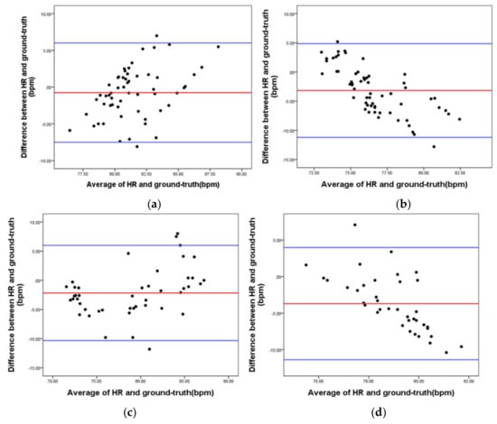 Bland–Altman plots for the driving dataset analyzed at a 95% confidence level. The above four plots were selected to show the stable results for various human heart-rate cases. The red and blue lines denote the means and standard deviations of the data points, respectively. Agreement levels were as follows: (a) 96.49%, (b) 96.72%, (c) 93.33%, and (d) 97.37%.