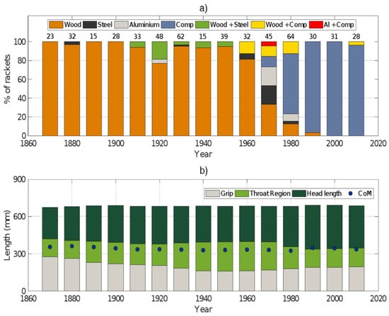 Bar charts showing: (a) The percentage of rackets of each material per decade (the values above the columns represent the number of rackets from each decade); and (b) the mean length of the grip, throat region and head (ext.) and the CoM location for the rackets per decade.