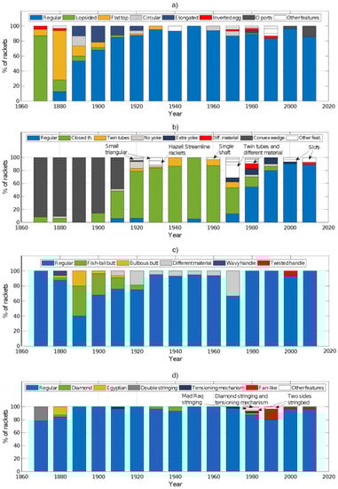 Bar charts showing the percentage of rackets with certain distinguishing features per decade; (a) head; (b) throat; (c) handle and (d) stringing pattern. Other features correspond to cases were there were less than five examples.