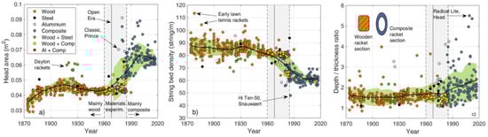 Figure 5 summarises how the head area, the string bed density and the depth to thickness ratio of the rackets changed over time. Figure 5a shows head area increased in the 1970s with material experimentation. The aluminium racket with a large head area (0.0702 m2) from 1976 was Howard Head’s ‘oversize’ design (Classic, Prince), following which there was an increase in the head area of the rackets (~0.045 to ~0.07 m2) coinciding with the move to composites. The collection of outlying green dots around the 1930s in Figure 5a represent rackets with a metal frame, which often had long heads and strings that extended to the handle (therefore head area may have been overestimated by assuming that the head is an ellipse). String bed density was almost constant before 1960 at ~85 strings/m, although some of the early rackets had densities exceeding 100 strings/m, as they had small heads and many (>45), narrowly-spaced strings (Figure 5b). String bed densities decreased to ~60 strings/m after 1980, with the move to rackets with larger heads. Figure 5c shows that from the 1870s to 1970, when most of the rackets were wooden with solid cross-sections, the ratio of frame depth to thickness was almost constant at ~1.6 (~12 mm frame thickness). After 1970, frame depth to width ratio steadily increased to about two (mainly due to an increase in frame depth from ~21 to ~25 mm), with ratios exceeding three in some rackets. Clear increases in frame to depth ratios followed the introduction of ‘widebody’ rackets in the late 1980s. These ‘widebody’ rackets have greater depth around the middle of the frame than at the handle and tip, providing the highest stiffness in the region of maximum bending [4,37]. The results indicate that composite rackets have more diverse cross-section shapes than their wooden predecessors.