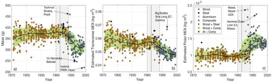 Figure 6a shows that the mean mass of the rackets remained almost constant from the 1870s to 1970, but the data points were scattered (μ ± σ, 370 ± 27 g). Mass dropped after 1980, and the composite rackets weighed ~40 g less than their wooden predecessors, with more variation (μ ± σ, 330 ± 40 g). The heaviest racket (Technort Stratos, Pirelli) had a ‘shock-absorption’ device in the handle. Figure 6b shows that Transverse MOI gradually decreased until the 1960s, which may have been due to the marginal shift of the CoM towards the handle (Figure 3a) [29] (as mass barely changed). Transverse MOI increased slightly after 1970s, most likely because the steel rackets tended to be heavier (Figure 6a) [29]. From the 1980s, Transverse MOI of the rackets dropped from ~0.057 to ~0.047 kgm2, mimicking the trend of mass [29]. Polar MOI (Figure 6c) showed little change until 1960 and then increased with the move to rackets with wider heads [29,38]. The racket with the widest head (Weed, with an illegal head width) had the highest Polar MOI (as found by [38]), while the lowest values were for narrow early tennis rackets (Figure 5a).
