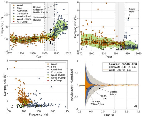 Figure 7a shows that natural frequencies for the wooden rackets typically fell between 80 and 120 Hz (μ ± σ, 99.4 ± 9.7 Hz). Natural frequencies increased to >120 Hz and became more varied (μ ± σ, 143 ± 27 Hz) with the move to composite rackets coinciding with deep frames (Figure 5c) and low mass (Figure 7a). Clear increases in natural frequency followed the introduction of ‘widebody’ rackets in the late 1980s. Figure 7b shows the wooden rackets tended to have the highest damping (~1.2%), followed by the composite (~0.6%) and metal rackets (~0.4%), in line with the known properties of these materials [39]. Figure 7c shows damping ratio vs. natural frequency and demonstrates that the rackets cluster by material. A low frequency and high damping cluster was formed of wooden rackets, a low frequency and low damping cluster was formed of metal rackets and a high frequency and low damping cluster was formed of composite rackets. Figure 7d shows vibration signals for three rackets. The metal racket had low-damped vibrations that lasted for a few seconds, while vibrations of the wooden racket only lasted for around half a second, due to its higher damping. Despite having low damping like the metal racket, the vibrations of the composite racket only lasted for about a second because they had a shorter wavelength (due to the higher natural frequency).