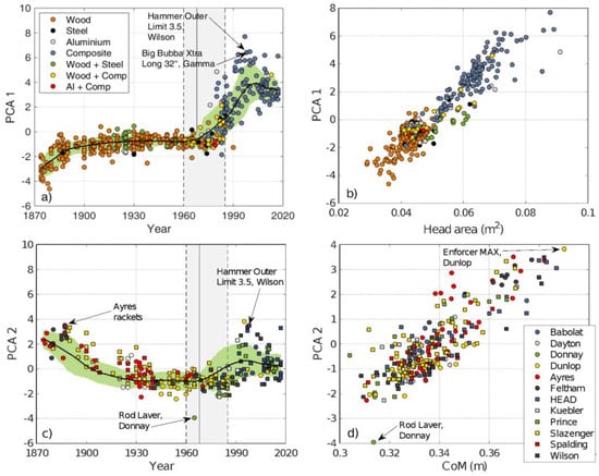 Results of PCA: (a) PCA1 vs. year, showing materials; (b) PCA 1 vs. head area, showing materials; (c) PCA2 vs. year, showing brands; (d) PCA 2 vs. CoM location, showing brands.