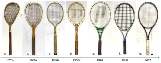 Seven tennis rackets showing developments over time: (a) Early racket by F. H. Ayres (1870s); (b) wooden racket by F. H. Ayres (1886); (c) steel racket by Dayton Steel Racket Corporation (1922); (d) Dunlop “Maxply” (1955); (e) Prince “Classic” (1976); (f) Snauwaert Hi-Ten 50 (1986); (g) Head Graphene XT Prestige with the sensor (2017).