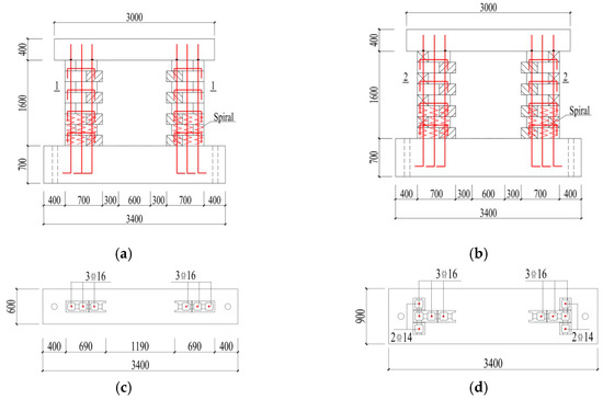 In this study, the seismic performance of four single-story, single-bay fully grouted reinforced concrete block masonry wall systems, subjected to in-plane cyclic lateral force, were studied, and they consisted of two symmetrically arranged reinforced block masonry walls. In China, infill masonry walls are often formed into a tooth shape at the boundary to enhance the connection with the concrete column [1]. Considering the need for reinforced concrete block masonry walls and infill wall connections, the specimens were designed with the tooth shape at the boundary to keep up with the structural form used in engineering practice. Figure 1 shows the configuration details of all specimens. All specimens consisted of a heavy bottom beam and a top beam to ensure fixed conditions at the bottom and lateral force exertion at the top, respectively. There are two categories in the experiment program: the rectangular section category and T-shape section category, and each category included two comparison specimens, with and without using prestressing technology. Table 1 summarized the dimensions and reinforcement details of the specimens. The abbreviated name of bare coupled masonry walls with rectangular section was BMF, and the abbreviated name of bare couple masonry walls with T-shape section was BMFT. Furthermore, to distinguish the comparison specimens, the specimen BMF with prestressing technology was defined as BMFP, while the specimen BMFT with prestressing technology was defined as BMFTP. Specifically, the reinforced concrete block masonry wall in the rectangular section category (BMF and BMFP) had dimensions of 590 mm × 190 mm × 1600 mm (length × width × height) and uniformly distributed two horizontal plain bars, with a diameter of 6 mm and spacing of 400 mm. The vertical reinforcement consisted of deformable bars, with a diameter of 16 mm, which was arranged at each cell of the specimen. The difference between the BMF and BMFP was that the vertical reinforcement of the BMFP was machined by threads. Compared to the rectangular section category, the T-shape section category (BMFT and BMFTP) had a flange at each of the reinforced block masonry walls. All reinforced block masonry walls had spiral stirrups on the bottom to enhance the compression performance of the end part of the reinforced block masonry walls.