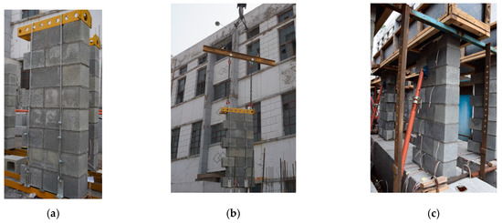 All specimens were constructed by experienced masons using a running pattern, and the precast technology was adopted. The construction process is shown in Figure 3. The hollow masonry walls and bottom beams were built up in adjacent locations at the same time. The horizontal reinforcement was placed on the hollow masonry walls, and the vertical reinforcement was resettled at the bottom beams in advance. After the hollow masonry walls were cured, they were fastened and placed on the bottom beam by lifting technology and adjusted vertically on the bottom beam by a steel strut, which was anchored to the ground. After that, the interfaces between the hollow masonry walls and bottom beams were filled with mortar. During the grouting process, the prestressing technology was applied as described in the previous section. The top beams of all specimens were constructed at the same time, and the specimens were cured under the appropriate environmental conditions.