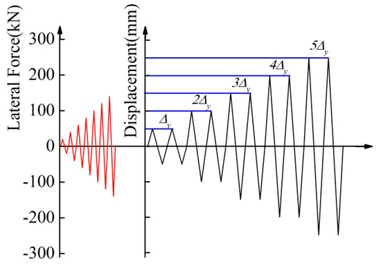 Considering the cracking characteristics of the masonry materials and conforming to the Chinese regulations [37], the load and displacement hybrid loading mode was adopted in this study, which consisted of a load control and displacement control. Figure 5 shows the loading sequence, which was also used in [27,28,29]. At the first, the specimen was controlled by a load, and the loading cycle was repeated once. Once the inflection point occurred at the load–displacement curves, the displacement control was adopted to replace the load control, and two cycles were completed for each target displacement increment. In order to fully obtain the seismic performance data of the specimens in the large displacement, and considering the safety of personnel, the test stopped when the lateral resistance dropped to 60% of the maximum lateral load recorded in the loading process, which was lower than the test stop condition recommended in literatures [6,7,8,9,10].