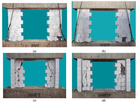 Figure 6 showed the final end state of all specimens. Two kinds of failure modes were observed. For the specimens with a rectangular section (BMF and BMFP), the cracks were either stepped cracks or diagonal cracks, and the cracks were concentrated at the top and bottom of the specimens, while few cracks appeared in the middle. The stepped cracks passed through the interface between the masonry units and mortar, while the diagonal cracks mainly appeared at the face of the masonry units. The stepped cracks were caused by a high shear stress, which exceeded the bond strength between the masonry units and mortar, while the diagonal cracks were due to the principal stress on the face being larger than the tensile strength of the masonry units. Moreover, the face of the masonry at the bottom of the wall was broken, and grouted concrete was exposed. This mainly related to the complex stress state of the repeated tension and compression on this zone due to cyclic loading. With regard to the specimens with a T-shape section (BMFT and BMFTP), the cracks were also of two kinds, stepped cracks and diagonal cracks, and the cracks developed exclusively on the surface of the masonry wall. The cracks firstly appeared at the interface between the masonry units and mortar located at the bottom of the masonry wall, and gradually developed from both ends to the middle of the masonry wall, which did not occur in the specimen with a rectangular section. A crossing crack occurred at the middle of the masonry wall, when the specimen reached its maximum capacity, and masonry face spalling occurred in that zone due to the repeated cyclic test. Additionally, only bed-joint cracks occurred at the flange, and there was no face spalling at the bottom of the flange (Figure 6e,f). This appearance can be explained by the influence of the flange, which enhanced the compression performance of the masonry wall. Furthermore, a main vertical crack occurred at the web face of the masonry wall, and its width was larger at the height of 400 mm or 800 mm than it was at a height of 600 mm, as shown in Figure 6c,d. This indicated that the crack propagation was related to the horizontal reinforcement, and the horizontal reinforcement diminished the crack width, which was arranged at the height of 600 mm.