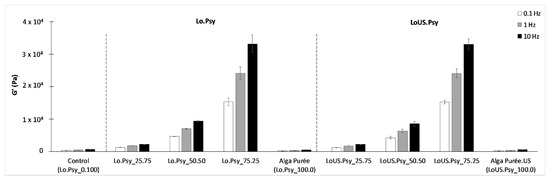 Elastic modulus at 0.1 Hz, 1 Hz, and 10 Hz of Laminaria-Psyllium gels with (LoUS.Psy) and without ultrasonic treatment (Lo.Psy), control, and Laminaria purées (Alga Purée; Alga Purée.US) [17].