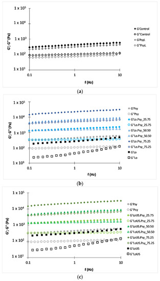 Mechanical spectra of the Psyllium gels prepared in water (control) and autohydrolysis liquor (PsyL).(a) Laminaria-Psyllium gels (Lo.Psy_25.75, Lo.Psy_50.50, LoPsy_75.25); (b) Laminaria with ultrasonic treatment-Psyllium gels (LoUS.Psy_25.75, LoUS.Psy_50.50, LoUSPsy_75.25; (c) G′, closed symbol; G″, open symbol.