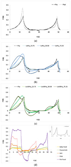 Each food system (e.g., jelly, mayonnaise, and baby food) presents texture properties that are specific, easily recognizable, and desired by the consumers. Despite the information given by the texture profile, the use of this methodology is very limited in the scientific literature. To our knowledge, no published studies refer to the texture features of commercial gelled products, therefore we show here some texture profiles of different commercial food products to illustrate the data for these systems to be used as a target for further product development. Based on these texture profiles (Figure 4d), three groups of samples can be discriminated: one composed of Pâté, Pet Food and Jam; another with Baby Food and Guacamole; and a third with Jelly Gum, whose graph is shown separately. In the first group of samples, the rupture point occurred at a low break distance, and the force reached a plateau until the probe retracted from the sample. This mechanical behavior was similar to what we found in LoUS.Psy_75.25 (Figure 4c) and has also been reported by Genovese and co-workers [30] for pectin gels. The control and PsyL texture profiles (Figure 4a) were similar to the one obtained by Figueroa et al. [21] for fruit jellies with Psyllium, although with much lower magnitude.