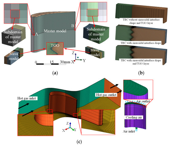 Based on the morphological characteristics of the TGO layer [27], a sinusoidal interface, as indicated in Figure 4b, was adopted to approximate the TGO and mixed layer with the wavelength of 0.04 mm and amplitude of 0.01 mm. Three kinds of slave models were established, as seen in Figure 4b, for the TBC with a flat surface, TBC with a sinusoidal interface, and TBC with a TGO layer. As high-temperature regions are usually at the center of the leading edge and trailing edge, two pieces of the TBC layer were defined as the subdomain of the master model in the positions. To prevent a large volume ratio of grid elements in the master model, the subdomain was slightly larger than the slave model.