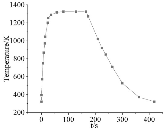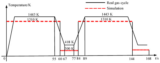 In general, the temperature curve of the thermal shock test is a series of trapezoidal waves, thus it is difficult to simulate the heat transfer process considering the time-varying momentum and temperature. As the heat transfer rate of gas is much larger than that of metals [18], the heating process of hot gas was neglected in the numerical simulation. With respect to the simulation study, a typical gas cycle profile is shown in Figure 9.