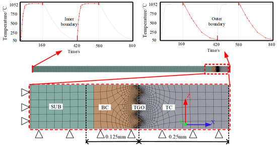 The 2D axisymmetric FE model was established by adopting a micro-segment with the length of 0.125 mm in the center of the heating part, as shown in Figure 6. In the 2D FE model, the size, structure, and material of the TBC layers were consistent with the slave model, and the thermal cyclic load and heating/cooling period were also the same as those in the test. We separated the measured temperature to the cooling temperature curve and heating temperature curve, which were assigned to the inner boundary and outer boundary of the 2D axisymmetric finite element model, respectively. Displacement constraints in the z direction and x direction were applied to the lower edge and inner edge, respectively. A fully coupling element, ANSYS-Plane 223, was used to simulate the transient temperature and thermal stress based on the thermoelastic damping matrix, i.e.,