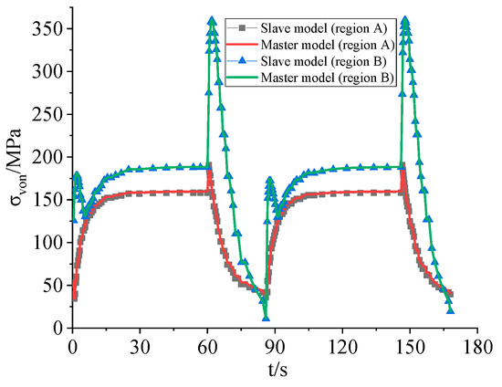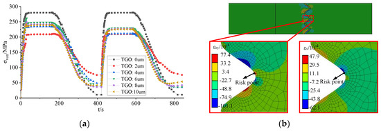 Six typical TGO thicknesses (0, 2 μm, 4 μm, 6 μm, 8 μm, and 10 μm) were selected in the simulation. To find the risk time and point in the thermal cycle, the von-Mises stress was selected, i.e.,