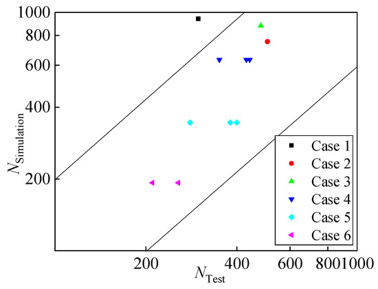 According to Equation (11), Equation (1) and the cyclic data in Table 5, the coefficients of Equation (2) can be obtained (i.e., a = 54, b = 3.45). In the same condition, more thermal fatigue test data are provided by Geng [37], and applied to verify the accuracy of the TFL model. The verification results are illustrated in Figure 8. As revealed in Figure 8, all of the TFL points were almost distributed in triple dispersion zone, which supports the validity and feasibility of the fitted phenomenological life prediction model.
