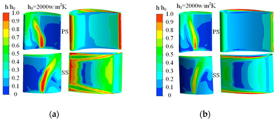 As revealed in Figure 10, the high-speed heat transfer regions were located on the leading edge, trailing edge, and the center of the inner surface of the master model, respectively. The convection heat transfer coefficient at the leading edge was larger because the leading edge was directed against the flow direction of the hot gas, and the kinetic energy and internal energy were directly converted to surface temperature. At the trailing edge, the high-temperature gas flowed along the surfaces of both the suction side (SS) and pressure side (PS), then mixed to form a strong turbulence intensity. The increase in the turbulent energy increased the heat transfer rate. In addition, the convective heat transfer coefficient of the heating stage was larger than that of the cooling stage due to the high gas speed in a high-temperature environment.