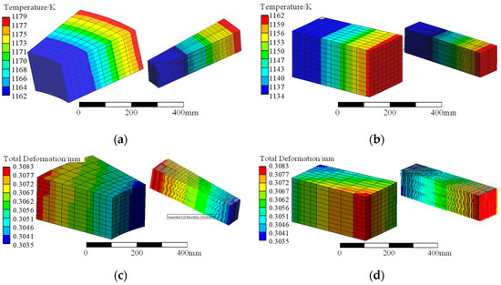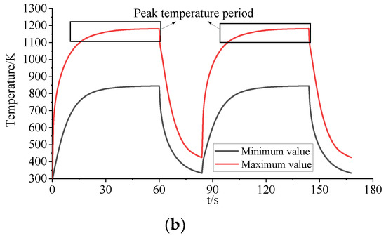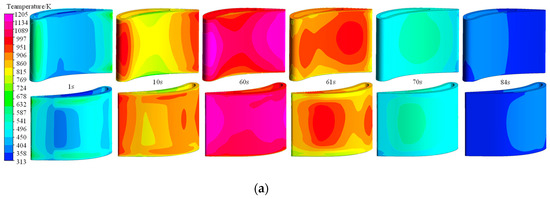 Based on the acquired convective heat transfer coefficient of the heating and cooling stages, the master model was applied to the thermo-elastic coupling calculation of the NGV for 168 s under the thermal cycle, where the heat fluxes at the upper and lower surface were 10,000 w/m2, referring to the solid rim [39]. The variation trend of the surface temperature field is shown in Figure 11.