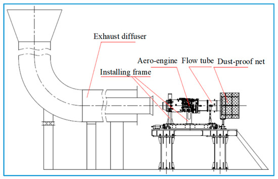 To verify the thermal-elastic simulation of the NGV, temperature-sensitive paint (TSP) technology was adopted to measure the surface temperatures of the NGV under the maximum operation conditions of a turbojet engine. The surface temperature tests for the NGV were performed inside an indoor aero-engine test rig at the China Gas Turbine Establishment, the structure of which is shown in Figure 12. The technical parameters of the engine are listed in Table 3.