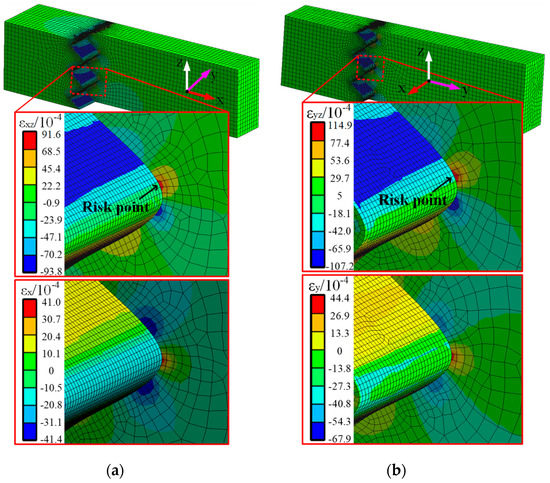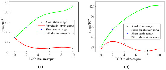 The maximum thermal stress of the TC layer is shown in Figure 7a. As seen in Figure 7a, the change in thermal stress basically agrees with the temperature curve in Figure 5, and the thermal stress increased with the increasing TGO thickness. The maximum thermal stress occurred in 50 s to 160 s in the first cycle. For the strain contour at the thickness of 2 μm, the shear strain and axial strain are shown in Figure 7b. The results in Figure 7b show that the maximum shear strain and axial strain are near by the bottom of the valley (i.e., point I and II, respectively). The cracks caused by shear strain were perpendicular to the mixed layer of the TGO, while the cracks induced by axial strain were tangent to the valley center (z direction in Figure 6). The value of the shear strain was higher than that of the axial strain, thus the grid node of shear strain was regarded as the risk point for the simulation. The axial and shear strain ranges at the risk point in one thermal shock cycle were imported into Equation (2), and the relationship equations of TBC thickness and strain under the ith operation condition were fitted as