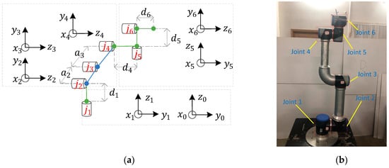 Using the DH method, the relations for a robot can be directly established in a visualized manner and the existence conditions for closed-form solutions can be derived in a more direct and visualized manner. The standard DH parameters in the case of the KingKong collaborative robot are shown in Table 3. A schematic diagram of the robot is shown in Figure 1.