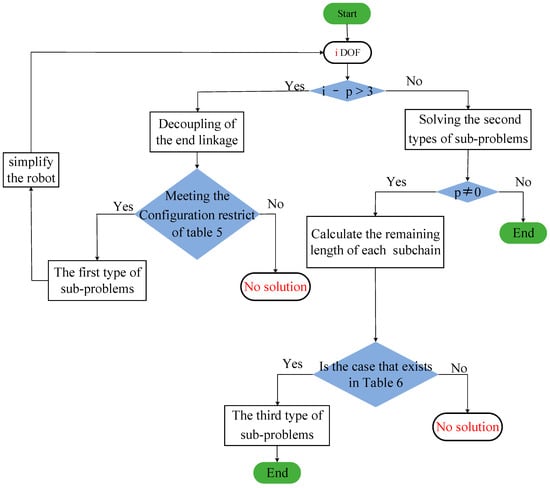 In the first type, when the number of unknowns in the rotational component is larger than three and the robot meets some structural characteristics, some joint angles can be preferably and directly solved using the translational component. This article refers to the first type sub-problem as the sub-problem of translation components.
