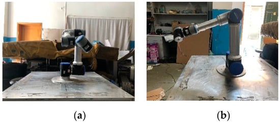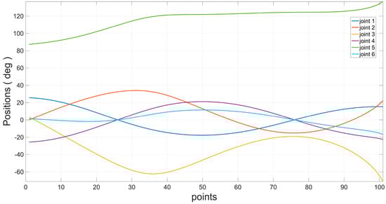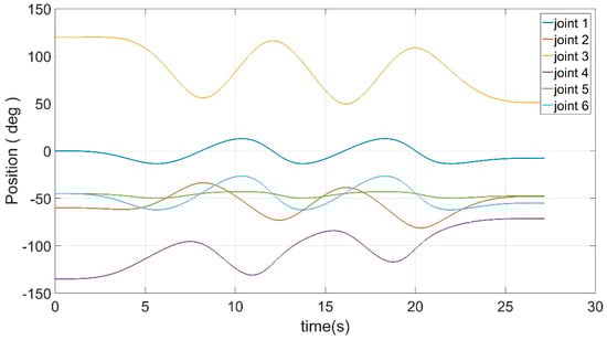 Figure 17 shows the position after the robot has finished its run. The curve of the actual motion of the robot in Cartesian space was calculated from the forward kinematics and is shown together with the planned spatial curve in Figure 18. After the run was completed, the actual motion curve of each joint was acquired from the controller, as shown in Figure 19.