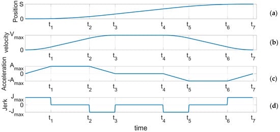 (a) Displacement of the seven-segment S curve over time. (b) Velocity of the seven-segment S curve over time. (c) Acceleration of the seven-segment S curve over time. (d) Jerk of seven-segment S curve over time.