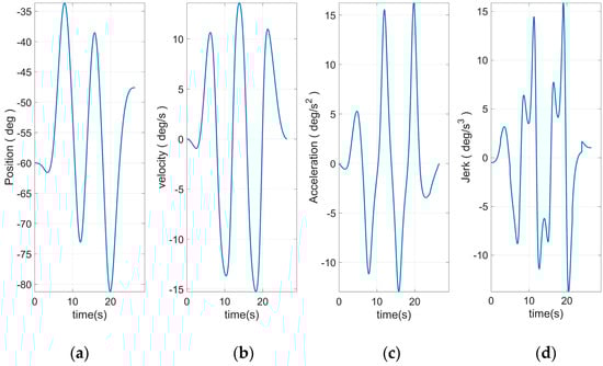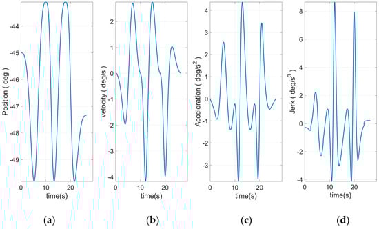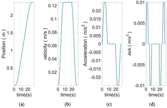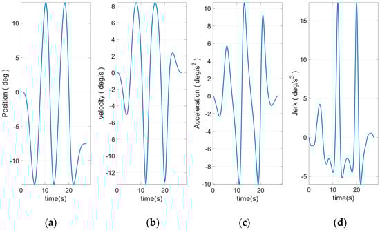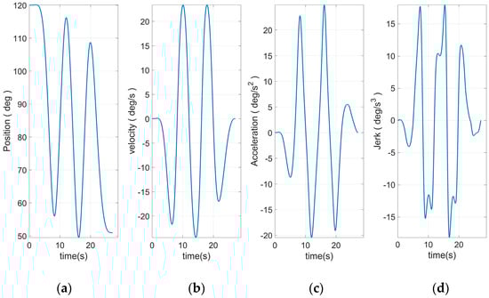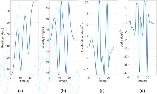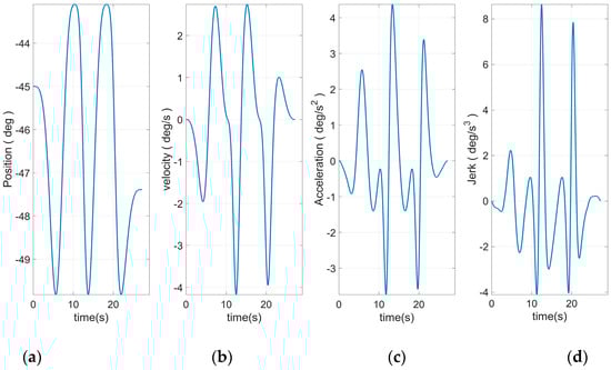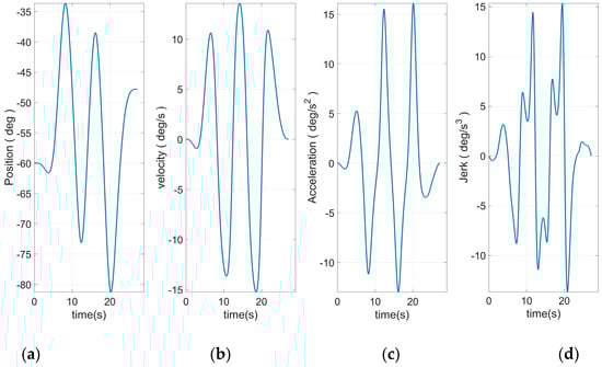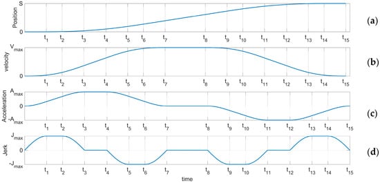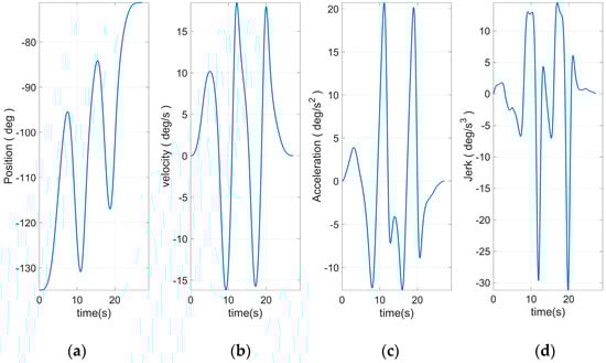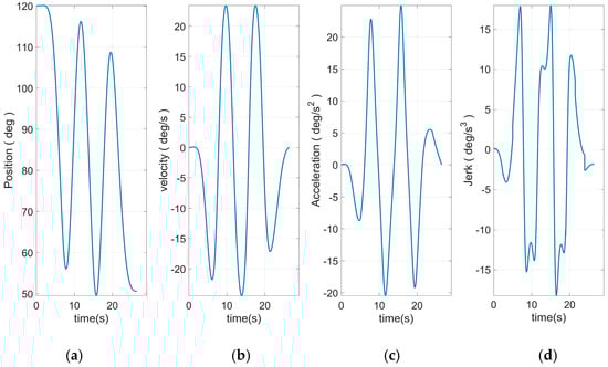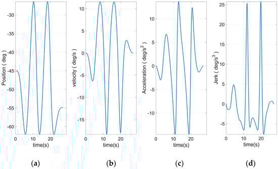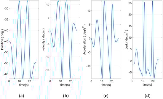 Figure 8 shows the end curve planned to use 15 S-curve segments. The apparent rise and fall process in the jerk curve could be seen. This allows the entire curve to have a smoother transition at start–stop. Based on Equation (46) and the plan in Figure 10, the angular curve of each joint could be obtained, as shown in Figure 11, Figure 12, Figure 13, Figure 14, Figure 15 and Figure 16.